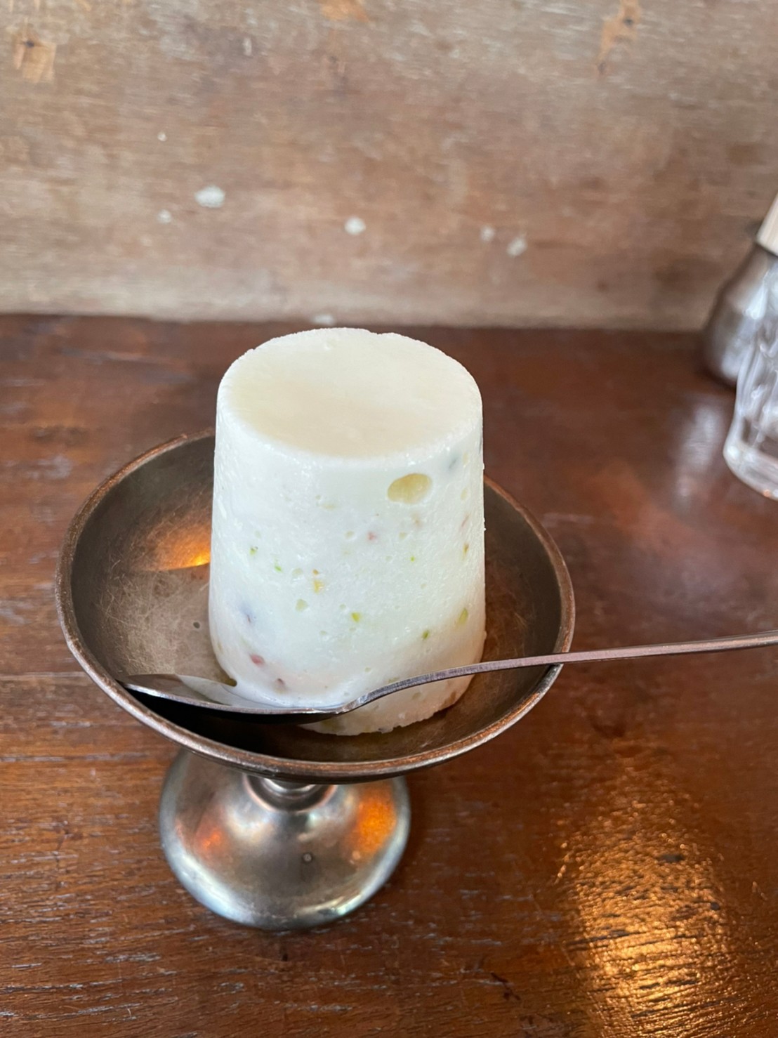 ココナツミルクの中に、いろんなスパイスやかぼちゃの種が入ってて、白くまアイスのインドバージョンって感じ。