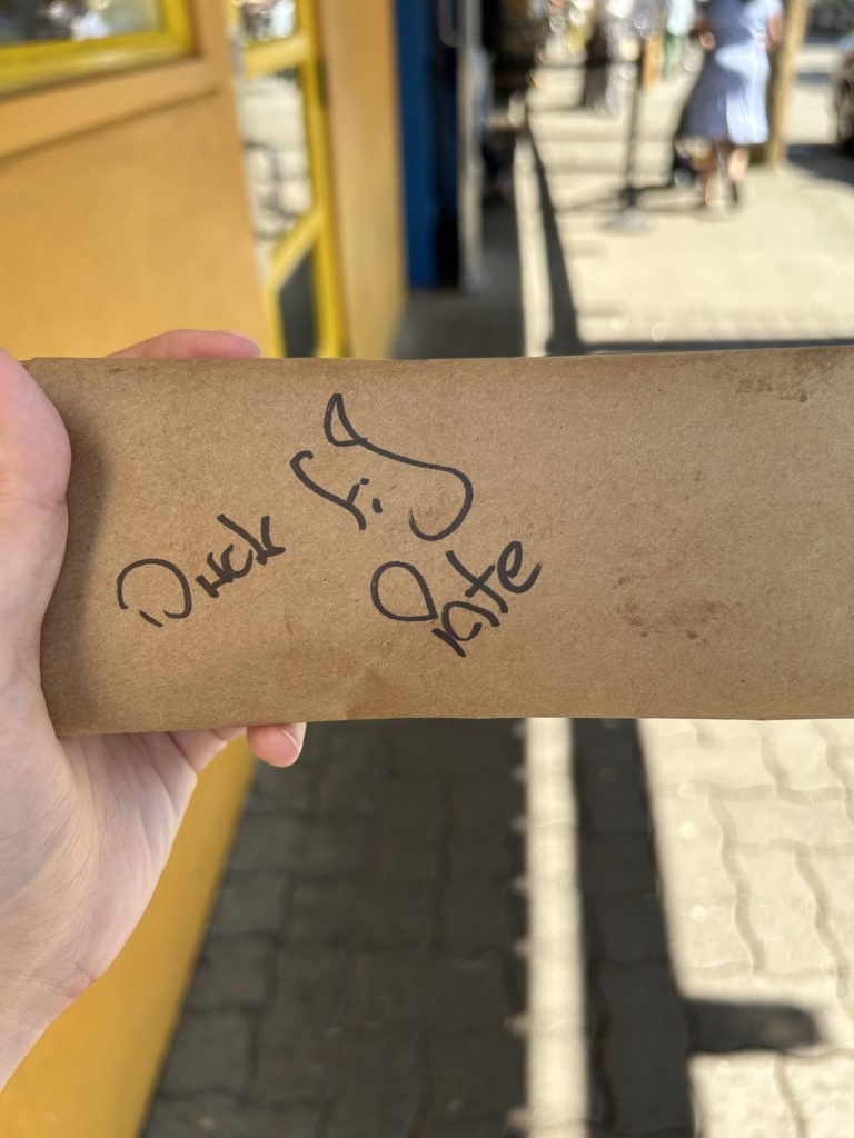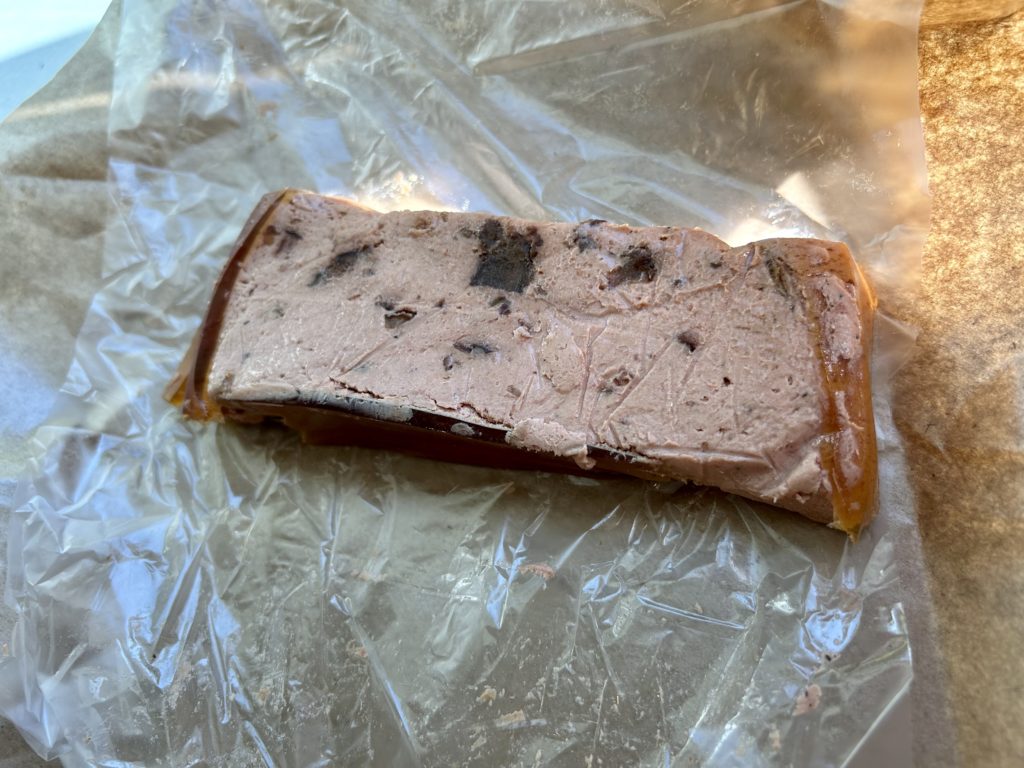 パテコーナーで、たくさんの種類があります。違いがよくわかりませんが、ダックか豚か聞かれたのでダックにして、その中でもフィグにした。フィグっていちぢくのことだよな。