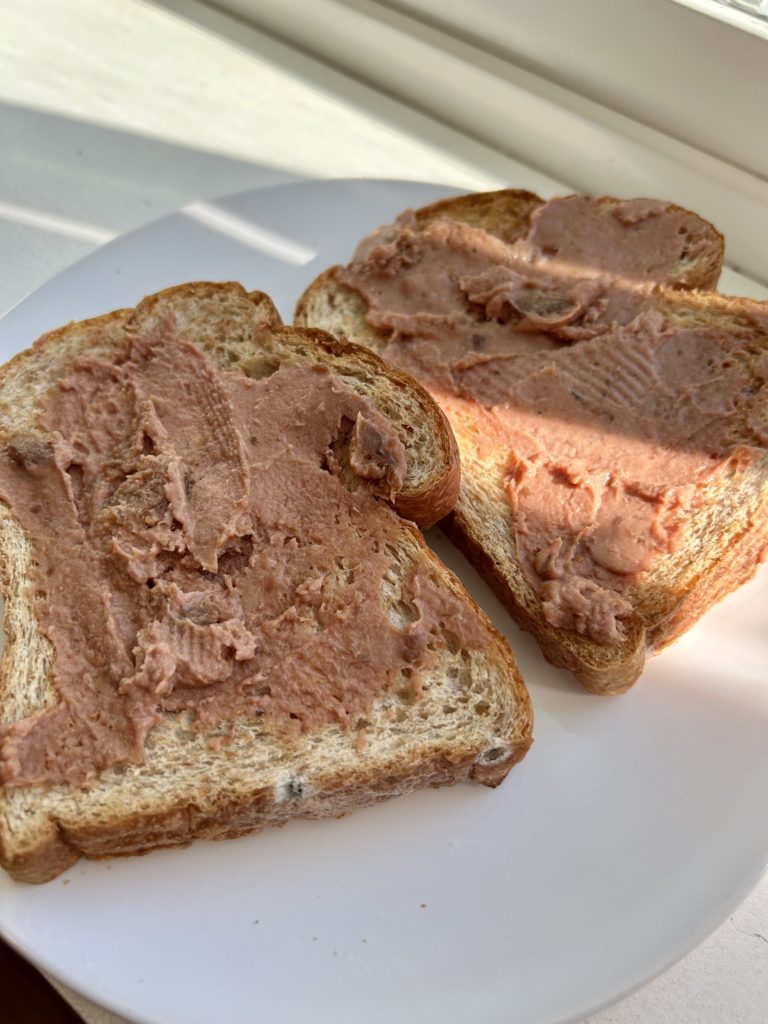 てか、買えばよかったです。家にあるのはブルーベリーベーグルと茶色いパンだからです。普通のフランスパン買っとくべきだったと後悔しながら、茶色いパンにパテを塗りました。