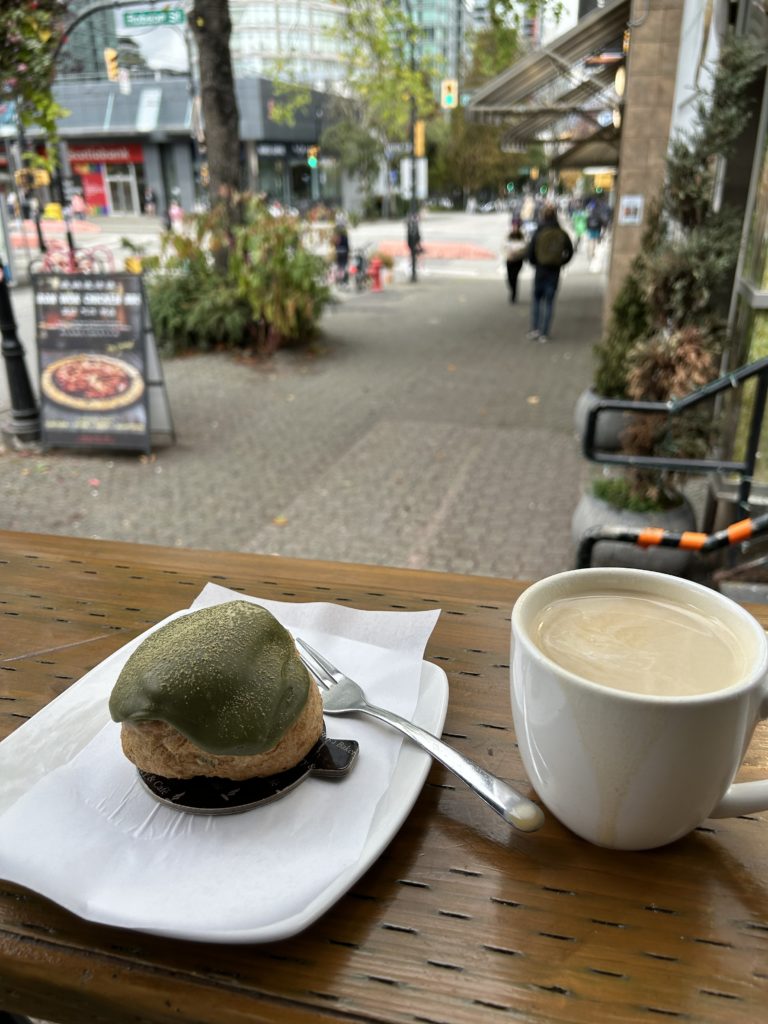 曇りが続くがルクスを浴びるために外で大好物の抹茶シュークリームを食べる